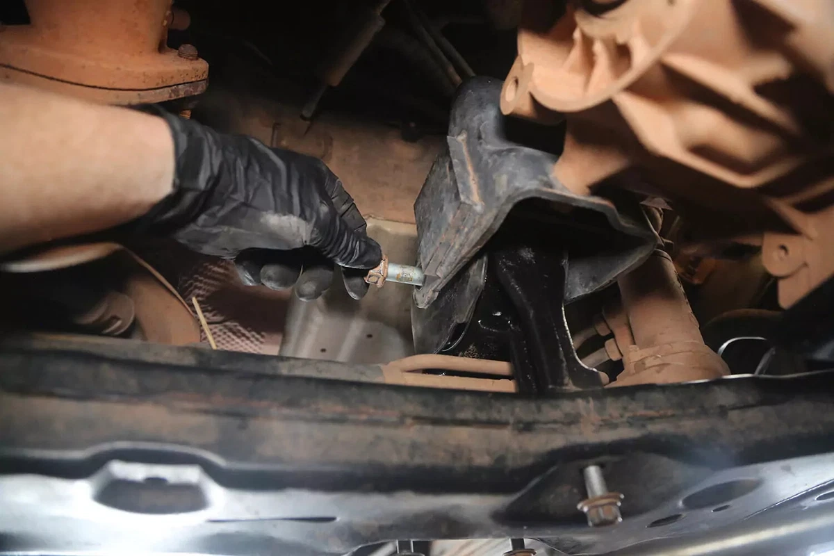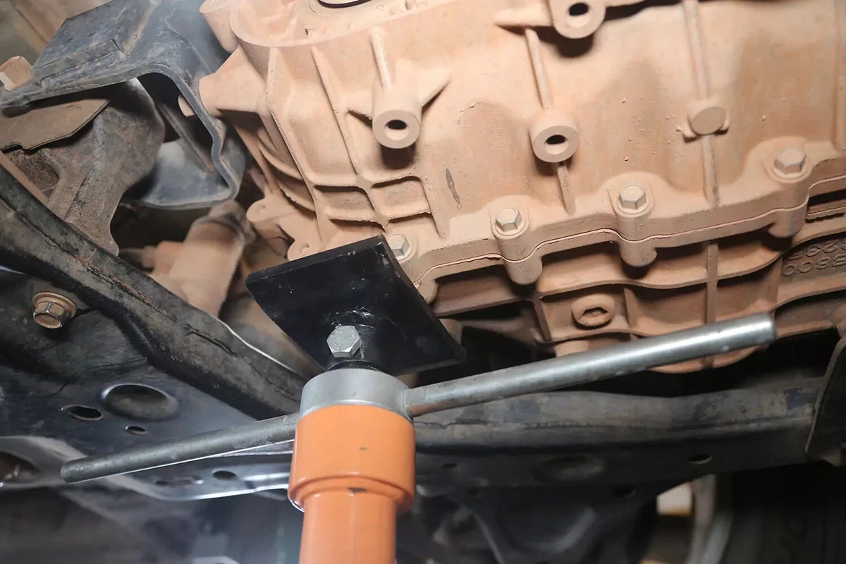 Nâng hộp số vừa đủ để lấy giá đỡ ra. Tuy nhiên, lực nâng quá lớn có thể làm căng động cơ và các giá đỡ hộp số khác.