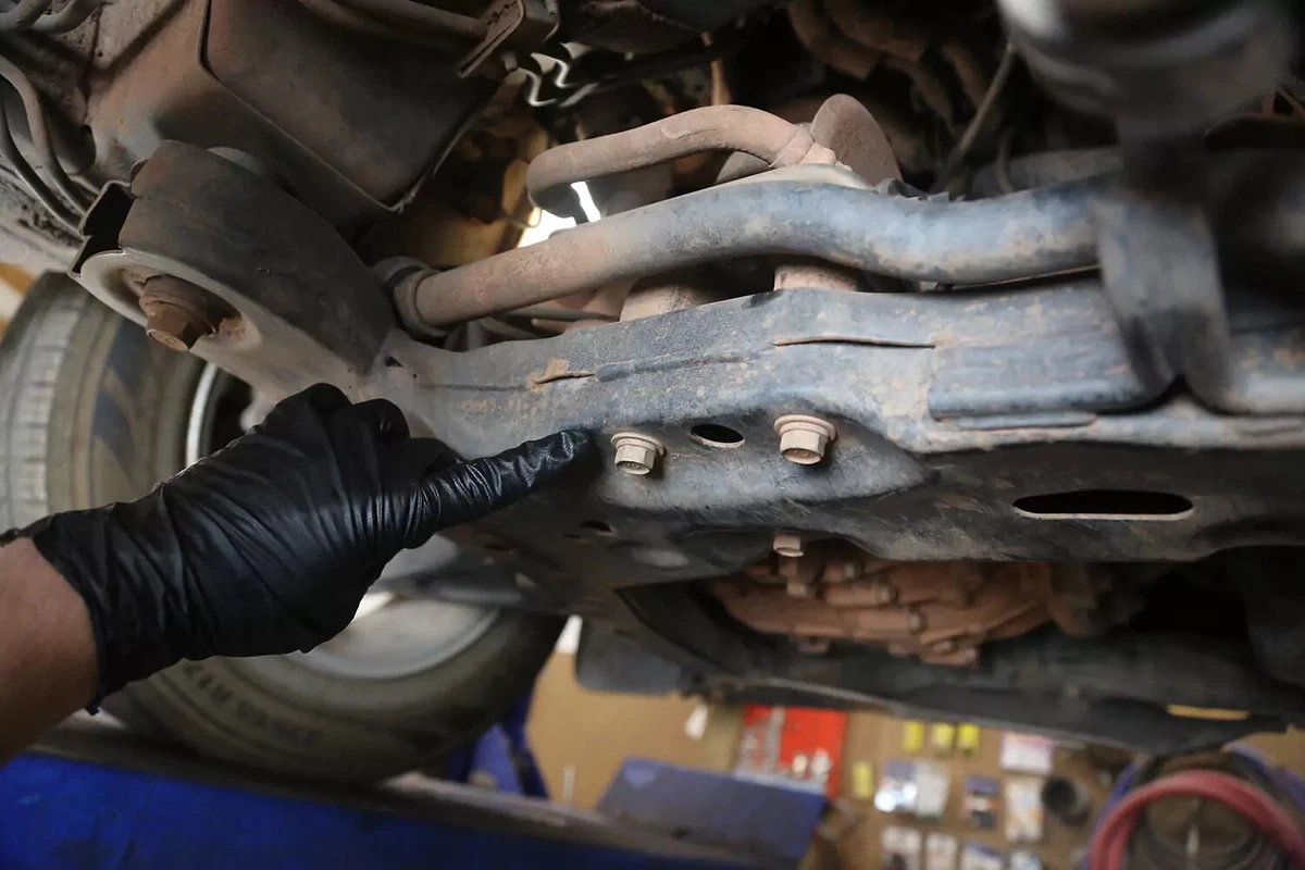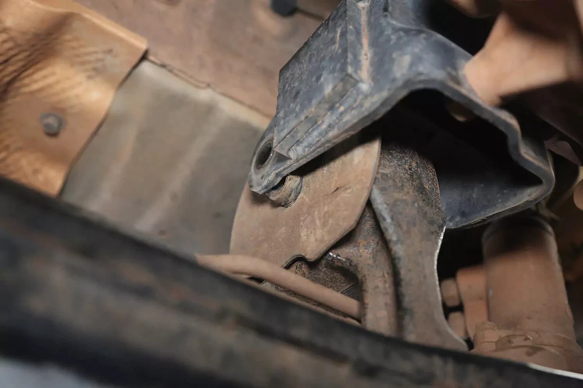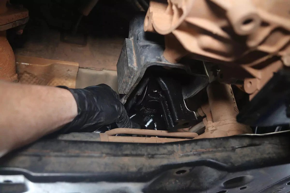 Trên xe demo FWD của chúng tôi, giá đỡ hộp số nằm phía sau hộp số trên khung phụ phía trước. Nếu bạn có xe AWD, 4WD hoặc RWD, giá đỡ có thể nằm ở phía sau hộp số, gần như đặt chính giữa ngay dưới xe, giữa hộp số và thanh ngang.