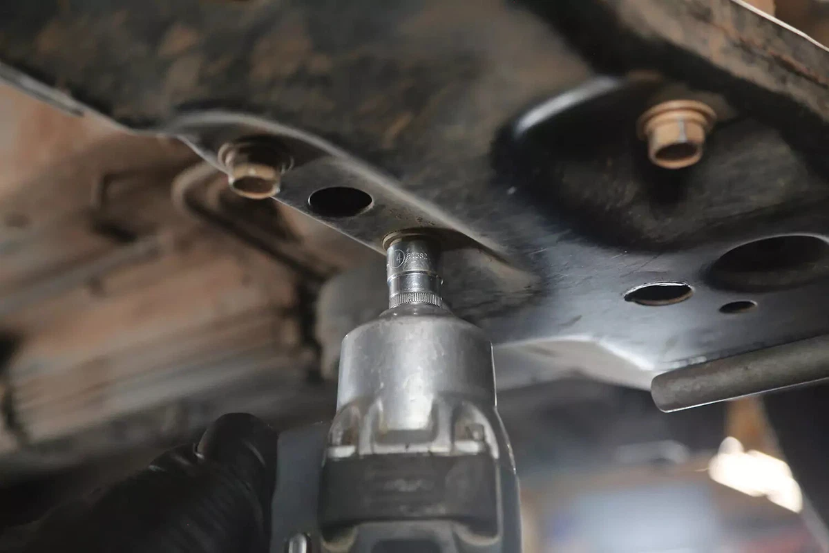 Đối với chiếc xe demo của chúng tôi, giá đỡ có ba bu lông trên khung phụ và một bu lông vào hộp số. Bốn bu lông nữa gắn giá đỡ hộp số vào hộp số. Trên hầu hết các loại xe, những thứ này không cần phải tháo ra.