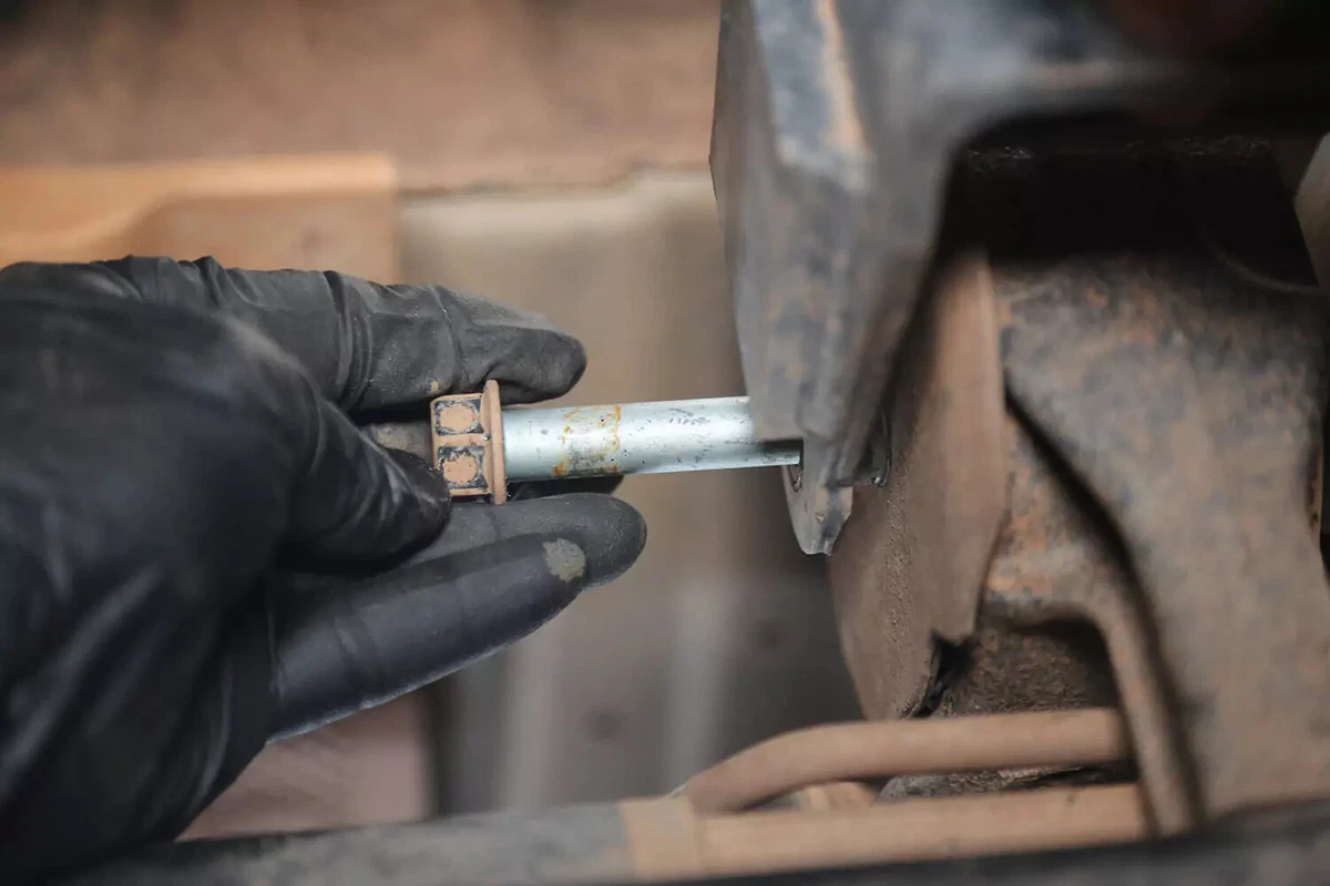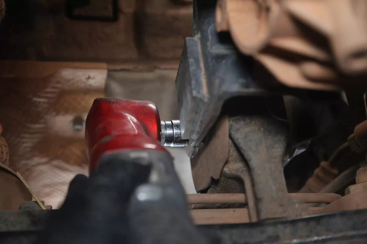 Xe demo của chúng tôi có một chốt ngang, được tháo ra bằng cờ lê ở một bên và ổ cắm ở bên kia. Những thứ này có thể khó loại bỏ trong những khu vực chật hẹp. Sử dụng thanh ngắt, cờ lê tác động hoặc thanh gian lận để có được đòn bẩy cần thiết.
